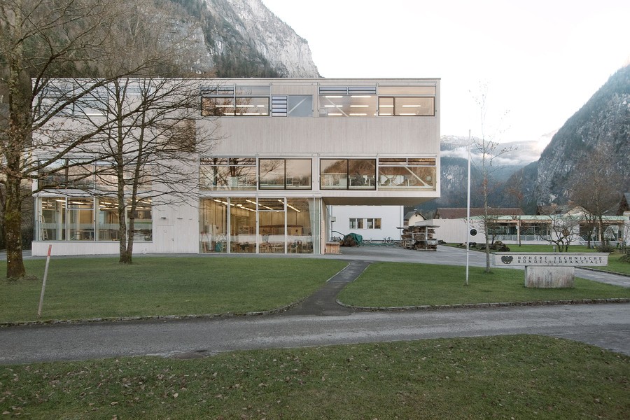 Das Werkstattgebäude der HTBLA ist ein Musterbeispiel für Hybridbauweise. Differenzierte Anforderungen aus funktionaler, städtebaulicher und konstruktiver Sicht wurden bei diesem Projekt in einem schlüssigen Gesamtkonzept gelöst, das darüber hinaus als Anschauungsobjekt für die dort auszubildenden Schüler dient. Auf einem Stahlbetonsockel kommt der 2-geschossige Holzbau in Brettsperrholz zu liegen, der durch seine Auskragung den Vorbericht der Bootsbauhalle stützenfrei überdeckt und somit nach außen funktional erweitert. Mittels sichtbarer und nachvollziehbarer Konstruktionsprinzipien (Zugelemente aus Stahl) generiert das Gebäude in seiner Gesamtheit eine überzeugende Atmosphäre. Diese konsequente Haltung bis hin zur sichtbaren Installationsführung im Innenraum stellt ein positives Beispiel für eine kostenbewusste und identitätsstiftende Mischbauweise dar. (Objektbeschreibung: proholz OÖ, Foto: Stefan Öhlinger)